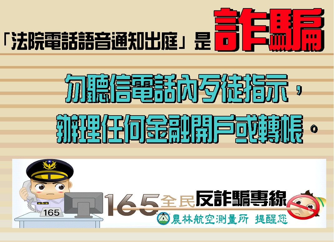 「法院電話語音通知出庭」是詐騙:勿聽信電話內歹徒指示,辦理任何金融開戶或轉帳。