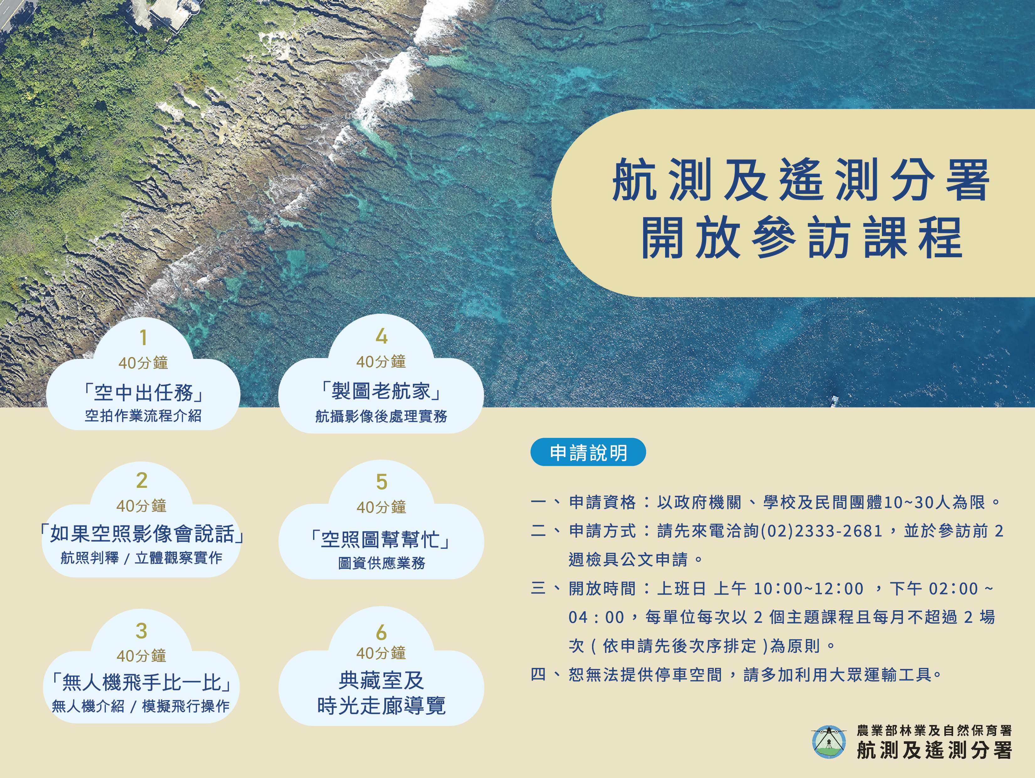 申請說明 一、申請資格:以政府機關、學校及民間團體10~30人為限。 二、申請方式:請先來電洽詢(02)2333-2681,並於參訪前2週檢具公文申請。 三、開放時間:上班日 上午10:00~12:00,下午02:00~04:00,每單位每次以2個主題課程且每月不超過2場次(依申請先後次序排定)為原則。 四、恕無法提供停車空間,請多加利用大眾運輸工具。 課程介紹 以下每項課程時間均為40分鐘 一、【空中出任務】空拍作業流程介紹 二、【如果空照影像會說話】航照判釋/立體觀察實作 三、【無人機飛手比一比】無人機介紹/模擬飛行操作 四、【製圖老航家】航攝影像後處理實務 五、【空照圖幫幫忙】圖資供應業務 六、【典藏室及時光走廊導覽】 航遙測分署參訪解說