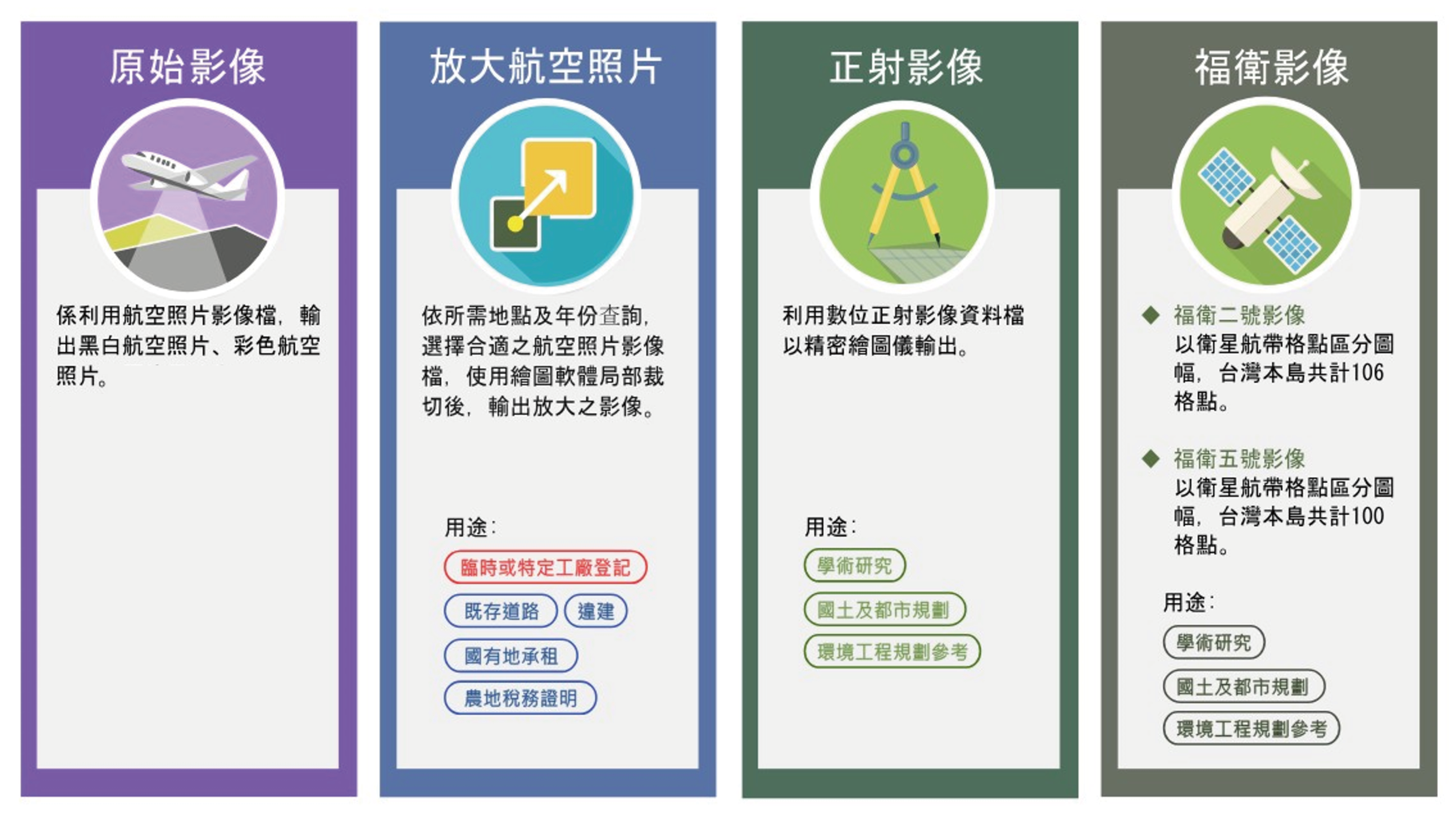 本分署對外供應之圖資種類如下: 1.原始影像 係由航攝飛機攜帶精密「空中照相機」自空中向下垂直拍照,將地面上地物、地貌做永久真實記錄,其比例尺取決於航高,並不固定。 民國62至90年間以黑白膠卷底片紀錄,90年起陸續改為彩色膠卷底片,再利用蔡司高精密影像掃描儀,掃描主要為高解析(14μ)影像檔對外提供。 民國96年起陸續採購ADS40、DMC、DMCIII等數位相機,取代傳統膠卷,影像品質大幅提升。 2.放大航空照片 申請人依據地點及年份查詢選擇所需之區域後,原始影像檔將予以裁切放大之照片紙圖,背後書註記檔名及拍攝日期可做為各類佐證及參考。尺寸有30cm×30cm、50cm×50cm(適用山區、地號範圍較大或特殊需求者)兩種。 3.正射影像 使用微分糾正方法將原本以中心投影之原始影像,消除改正移位及比例尺之誤差,加註圖號、圖名等說明之影像檔,除電子檔外亦可提供紙圖輸出。 比例尺固定為1/5000,地面解析度依相機不同,有15cm、25cm、37.5cm或50cm不等。 4.福衛影像 福爾摩沙衛星二號影像為我國自主擁有的第一枚遙測衛星,其二號衛星於民國93年5月發射,於105年8月退役,提供對地解析度黑白影像2公尺,彩色8公尺之影像資料,可應用於國土規劃、資源探勘、環境保護、防災救災等。 福爾摩沙衛星五號影像於106年8月發射,其解析度黑白仍為2公尺,彩色影像則提升至4公尺。