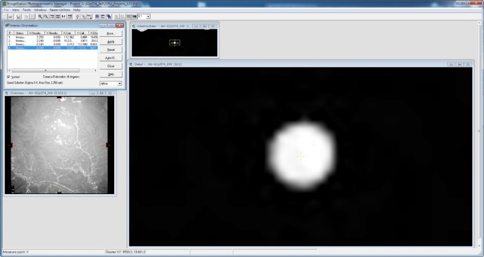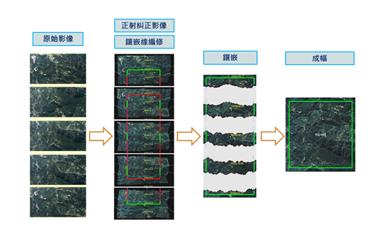 本分署早期為配合森林資源及土地利用調查與臺灣地區像片基本圖測製工作,引進航測技術,購置飛機及航空攝影機執行航攝影像蒐集工作,並引進德國類比正射製圖技術,進入機械立體製圖時期。84年起為提升圖資產製技術,導入數化製圖系統,航空照片經高解析度掃描後以個人電腦結合新購置數化測圖儀(P33),可同時進行數值地形圖測繪,將製圖業務由傳統機械立體製圖時期推向數值製圖之新領域。 隨著科技的進步,96年購置新型航測數位相機,配合數值航測工作站及數位訊號立體製圖套件設備,搭配機載定位定向系統(Position and Orientation System, POS)資料與數值地形模型。目前主要製圖業務如下: (一)數值影像正射作業 本分署製作之數值航攝正射影像主要以POS取得資訊進行解算,獲取相機之位置與姿態參數即外方位參數等資料,並使用外部數值地形模型,縮短製作時程,可大量批次快速產製出比例尺一致及帶有地理坐標之正射影像。 經以地面實測點位坐標或其他可靠來源點位坐標進行精度檢查作業,確認在合理精度範圍,接續進行影像色調處理及影像鑲嵌等程序,並參照比例尺五千分之一的基本圖制式圖幅進行規格化輸出,以利管理及應用。最後再進行機敏區域遮蔽處理及圖幅資訊編纂後,即作為正射影像成圖產品供應。 數值影像正射作業示意圖 (二)類比式航空照片正射作業 為延伸航攝影像應用之時間軸度,使早期之類比形式(即底片)航空照片更為活用,便於農林漁牧及國土利用之監測及分析,爰將歷史航攝底片經精密數位掃描儀進行數化轉製。並將不具備方位資訊之歷史航攝影像,運用航測方法重新定位,並產製正射影像。 辦理類比式航空照片正射作業時,應依掃描影像之框標,建立像片內方位後,以人工逐一尋點方式,於現有正射影像與類比航照影像上尋找大量地物未曾變遷之相同點位,並套疊數值地形模型資料,推算各地物點地面三維坐標,施行量測,再以影像空間後交會(單張)或空中三角平差方式,計算類比航照影像外方位資訊,始可進行正射處理作業。 類比式航空照片掃描影像 類比影像框標量測